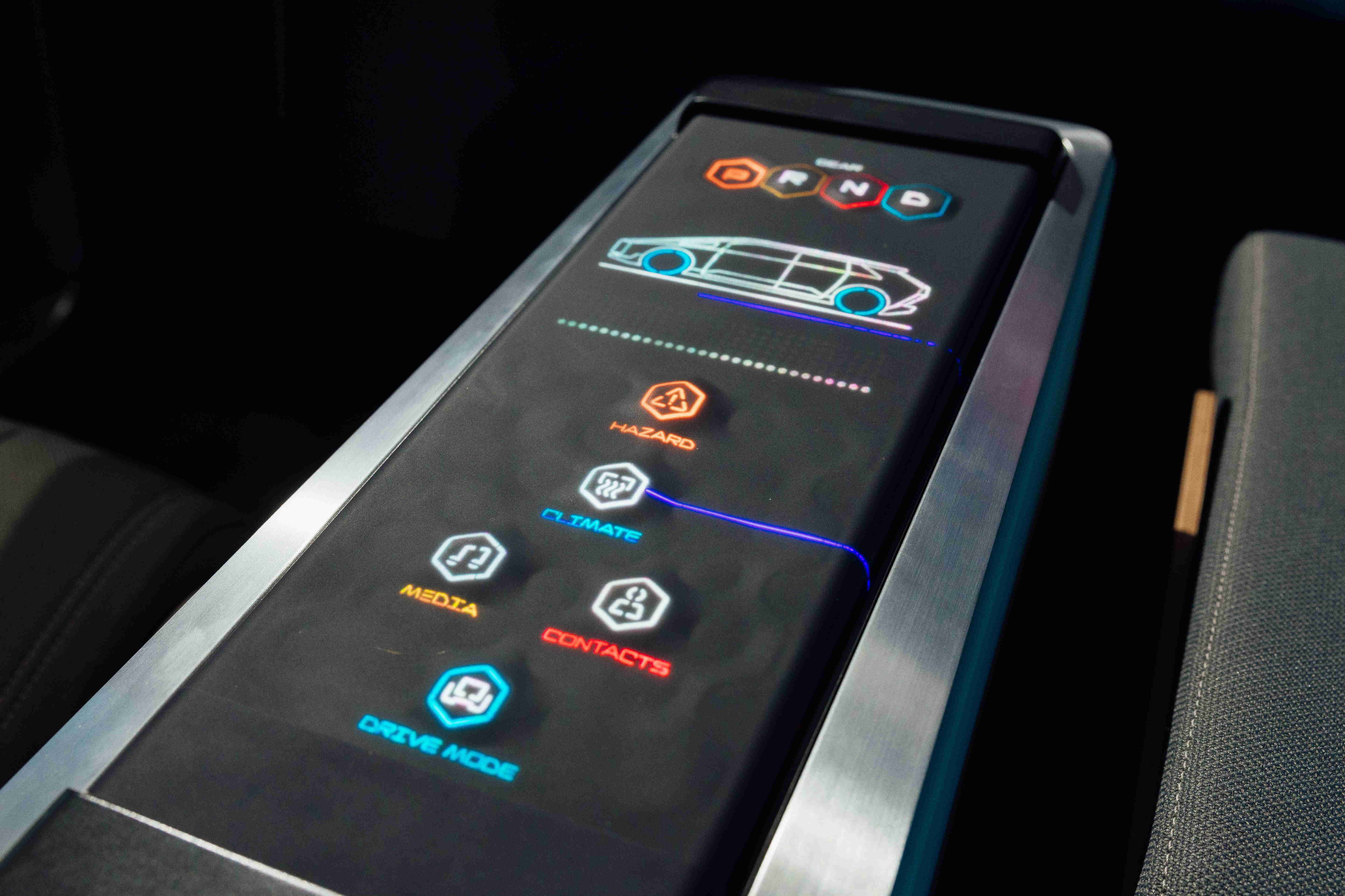 多變形態中控顯示(Morphing Center Control)擁有動態變化的表面,平時常態顯示車輛功能,進一步操作時,則會隆起成為3D 按鈕,并在觸控時以震動回?。躍傅牟僮骺慈嘶ザ戮辰?。