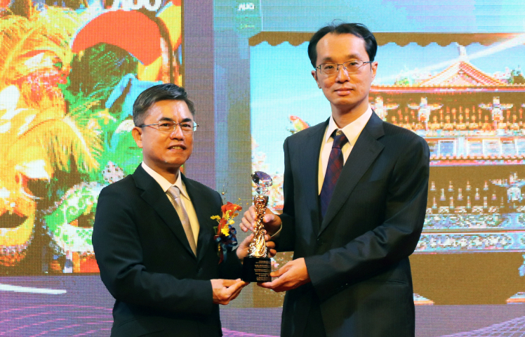 友達榮獲 2020 年中科優良廠商創新產品獎,由友達技術開發總部資深協理吳仰恩 (右)代表領獎 |