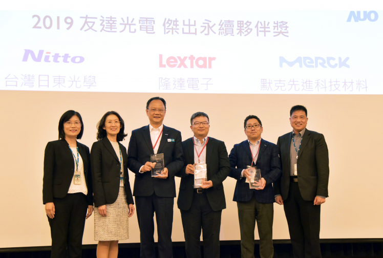 友達肯定供應商永續(xù)經營的優(yōu)異表現(xiàn),頒發(fā)傑出永續(xù)夥伴獎 (圖左到右:友達光電永續(xù)長古秀華、友達光電供應鏈總部資深協(xié)理吳宜芳、默克先進董事長謝志宏、隆達電子財務副總張博儀、臺灣日東光學董事長塩見太、友達光電董事長暨執(zhí)行長彭雙浪)