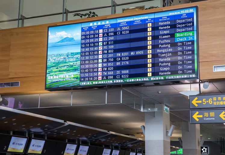 友達位於臺北松山機場的兩座拼接牆顯示器,各以 12 片 55 吋公共訊息顯示器所組成,具有高解析、低反射、極窄邊框的搶眼設計。極窄邊框拼接技術讓相鄰螢幕拼接後的邊框寬度僅 1.8mm,近乎無接縫的觀看視野搭配獨家色彩及亮度調校技術呈現完美的畫面均勻度,可讓旅客視覺跳脫螢幕邊框聚焦於整體影像內容,打造沉浸式觀賞體驗,呈現航班資訊的同時也為廣告主創造最佳宣傳效益。此外針對機場等大型公共工程對於品質、耐用度的高度要求,整合卓越的影像顯示技術及區域調光低耗能設計,長時間播放仍可實現絕佳的耐用度和視覺效果。
