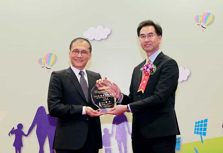 友達榮獲「105 年國家永續發展獎」之「永續企業獎」,並由友達總經理暨營運長蔡國新 (右) 代表領獎 |