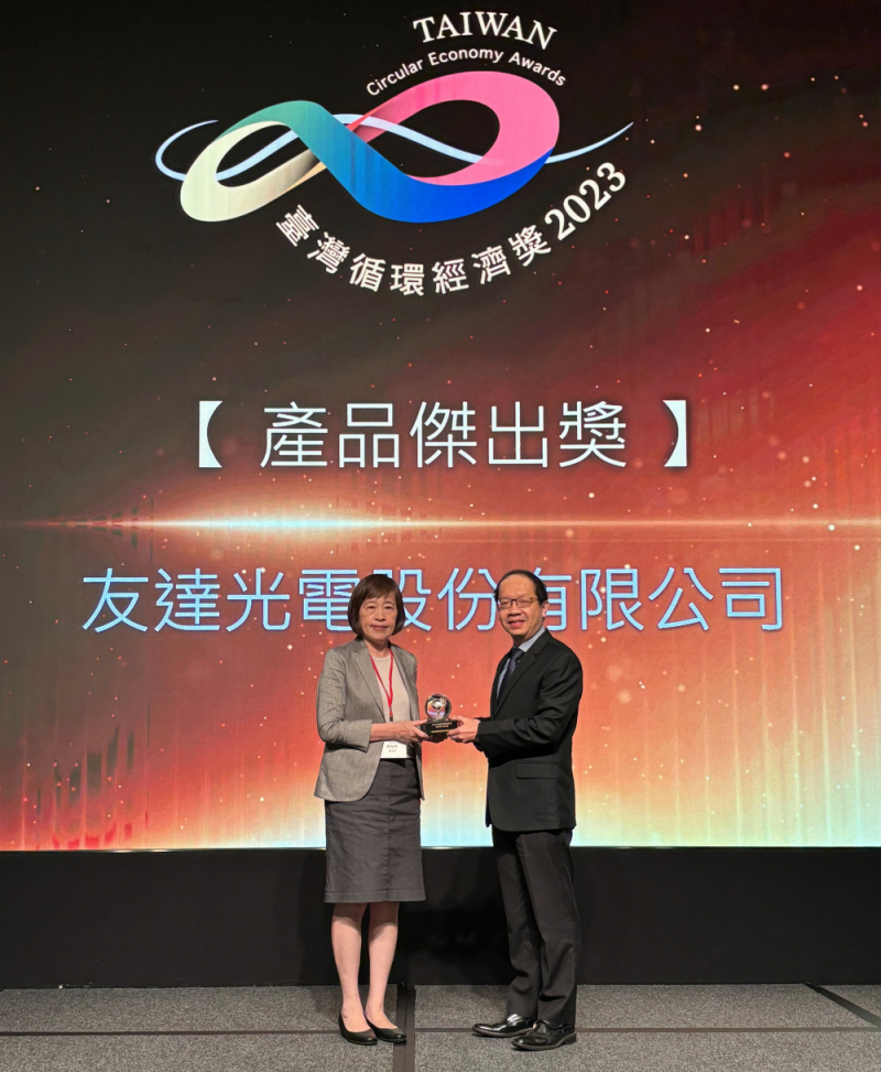 友達光電響應聯合國永續發展目標(Sustainable Development Goals, SDGs),依循SDG 12「責任消費與生產」制度,致力推動綠色製造、擴大循環經濟影響力,對內從循環產品之設計販售、製程原料回收、廢棄物減量等面向著手,對外與合作夥伴共同推動包材回收、研發再生料技術及製程材料循環,落實綠色製造與資源循環利用,在本年度臺灣循環經濟獎之產品傑出獎肯定。臺灣循環經濟獎係由中華經濟研究院設立之獎項,旨在鼓勵各界積極投入循環經濟,友達以優異之循環經濟成果,自首屆起連年締造佳績,展現企業落實循環經濟的價值。